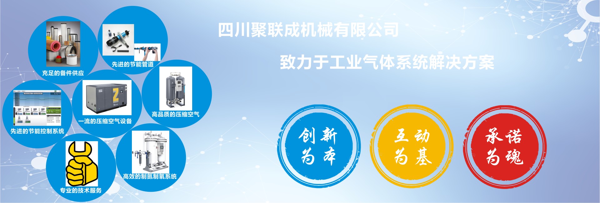 聚聯成一直致力于工業生產解決方案的系統供應商我們憑借與Atlas Copco(阿特拉斯·科普柯)、BEKO(貝克歐)、GardnerDenver(格南登福工業集團)CompAir(康普艾)、同悅氣體等國際品牌之間的密切合作關系,我們的解決方案包括氣體壓縮機、氮氣氧氣設備、空氣處理系統、維護保養、通過專業的產品技術與高級服務工程師團隊,具備專業的技能,聚聯成將為您提供優質的產品和服務